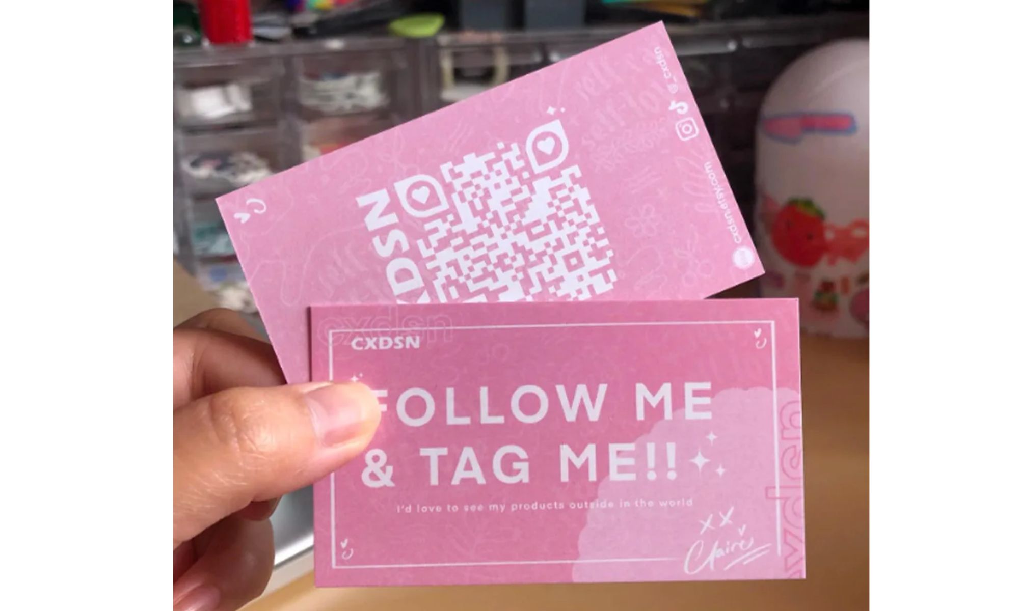 Hãy cho khách hàng biết họ có thể tìm thấy bạn ở đâu trên mạng xã hội. Ở mặt sau danh thiếp, bạn có thể thêm các biểu tượng của nền tảng xã hội bạn sử dụng cùng với tên tài khoản. Bạn có thể thêm lời kêu gọi, khuyến khích khách hàng theo dõi và gắn thẻ bạn trong các bài đăng của họ. Bạn cũng có thể thêm mã QR liên kết đến tài khoản mạng xã hội mà bạn lựa chọn!