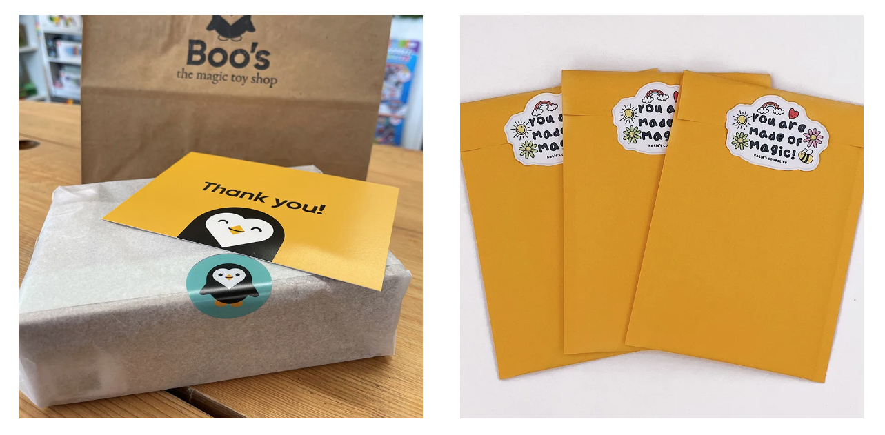 Thay băng keo đóng gói bằng nhãn dán bất cứ khi nào bạn có thể - Boo's Toy Shop dùng nhãn dán có hình linh vật của họ dán hộp quà thay vì sử dụng băng keo. Trong khi đó, Katie's Collective sử dụng nhãn dán có khẩu hiệu để mang lại năng lượng tích cực cho các phong bì thông thường. Cả hai ví dụ về nhãn dán này đều cho thấy nhãn dán của bạn có thể hiển thị thứ gì đó khác ngoài Logo của bạn. Cân nhắc đặt hàng một loại nhãn dán có dòng giới thiệu, Logo theo phong cách thương hiệu của bạn hoặc những câu trích dẫn đầy cảm hứng.