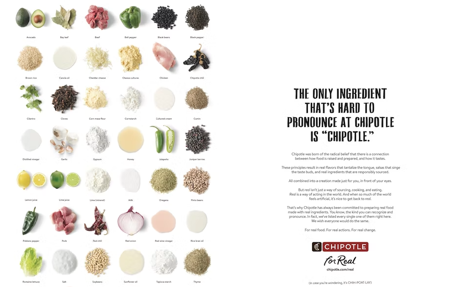 Chiến dịch “For Real” của họ thể hiện sứ mệnh và giá trị này bằng cách làm nổi bật các thành phần của nhà hàng và tính nhất quán giữa các cửa hàng. Ngay cả với nội dung trên trang web của họ - “Một bữa ăn có thể không thay đổi thế giới, nhưng cách chúng ta chế biến nó thì có thể.” - Chipotle xây dựng một thương hiệu nhà hàng nhất quán, dựa trên sứ mệnh của mình.