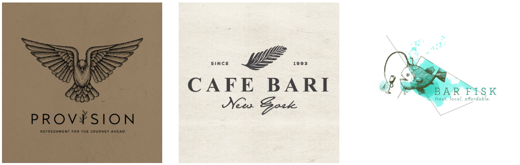 Nhưng không chỉ vậy, một logo có thể mang lại toàn bộ tính cách thương hiệu của bạn đến với khách hàng. Một phông chữ serif hoài cổ với nền đơn sắc có thể gợi lên những phong cách cổ điển, vượt thời gian, như logo Cafe Bari đã thể hiện. Logo màu đen và vàng của Provision, một sảnh phục vụ cocktail, trở thành một chi tiết tuyệt đẹp trên menu, khăn ăn và danh thiếp.