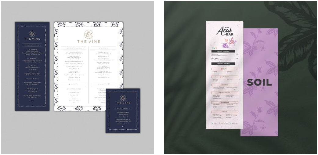 Menu của cửa hàng F&B là yếu tố thiết kế kết nối trực tiếp mọi người với món ăn của bạn, vì vậy hãy đảm bảo menu của bạn trông hấp dẫn, có thương hiệu và chuyên nghiệp. Thông qua ngôn từ, màu sắc và hình ảnh, hãy cung cấp cho khách hàng của bạn cảm nhận về những gì sắp được phục vụ.