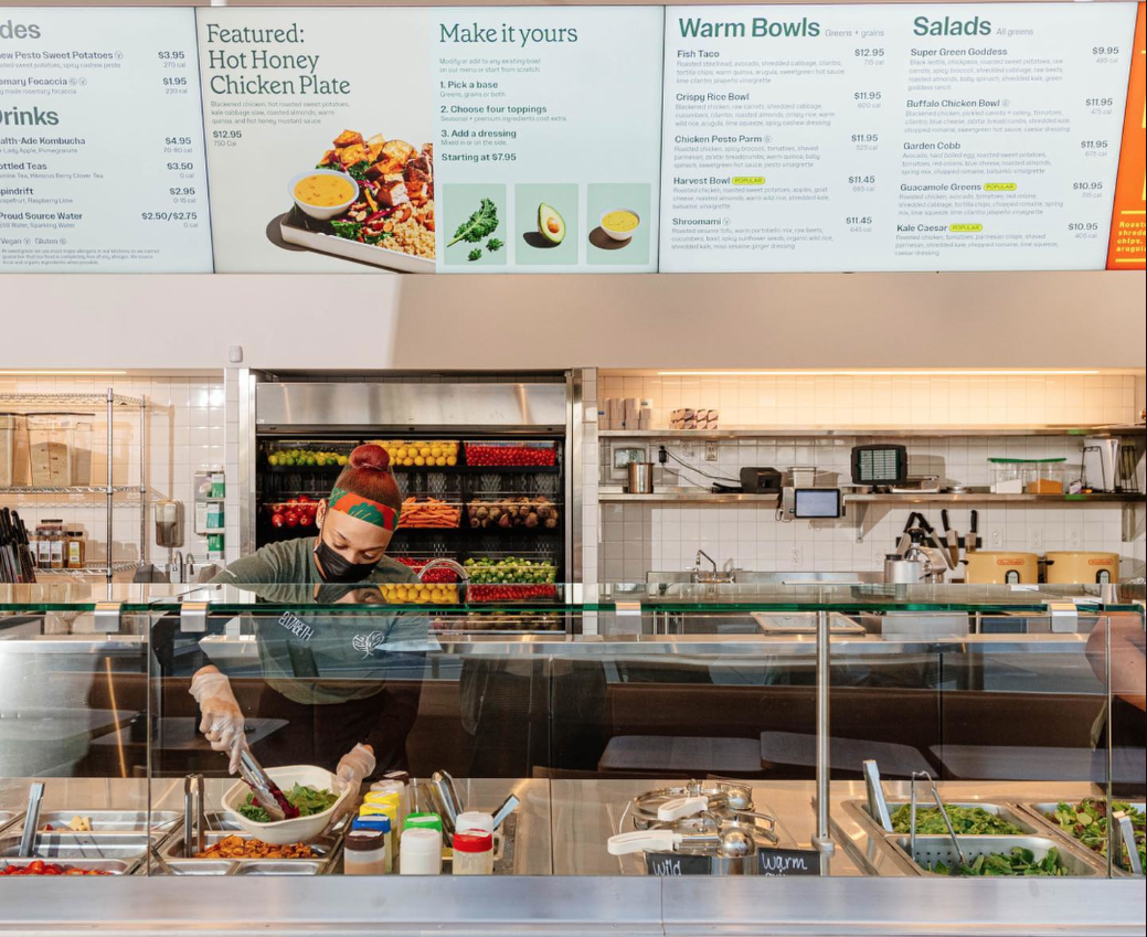 Để đưa ra một ví dụ về cách các yếu tố thiết kế chính hỗ trợ cho nhau trong việc xây dựng thương hiệu nhà hàng, chúng ta có thể xem qua thương hiệu của Sweetgreen. Sweetgreen là một chuỗi cửa hàng salad, phục vụ chủ yếu vào bữa trưa cho nhân viên văn phòng. Sweetgreen là thương hiệu của ai? Họ là một thương hiệu đơn giản, tiện lợi, muốn kết nối mọi người với các nguyên liệu sạch có nguồn gốc rõ ràng. Họ nhấn mạnh vào cách họ muốn tác động đến mọi người để ăn uống lành mạnh và có ý thức hơn.