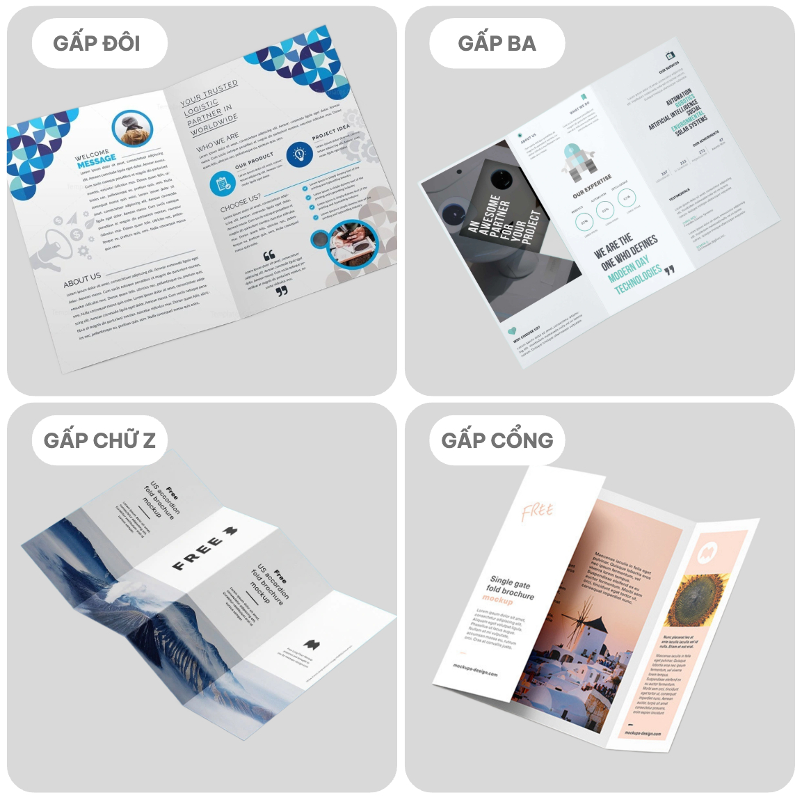Sẽ có nhiều dạng gấp brochure khác nhau, tuy nhiên sẽ có 4 dạng gấp chính là: gấp đôi, gấp ba, gấp chữ Z, gấp dạng cổng.