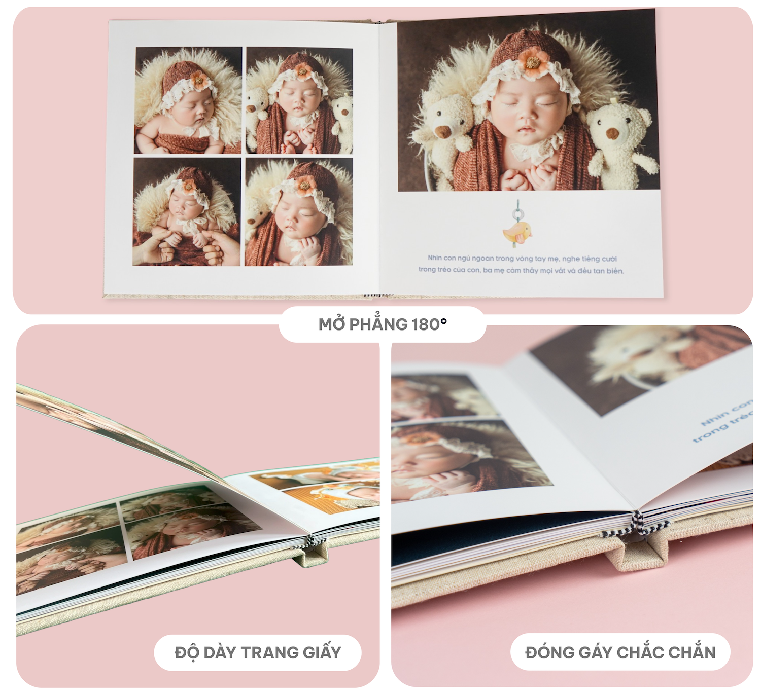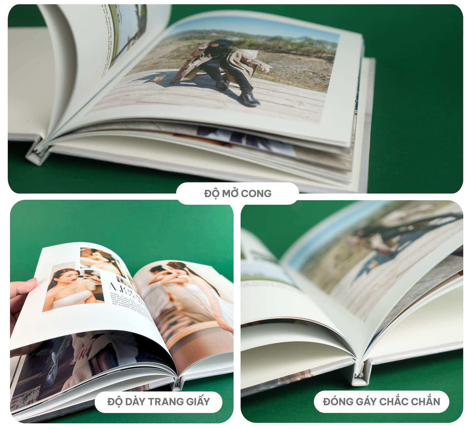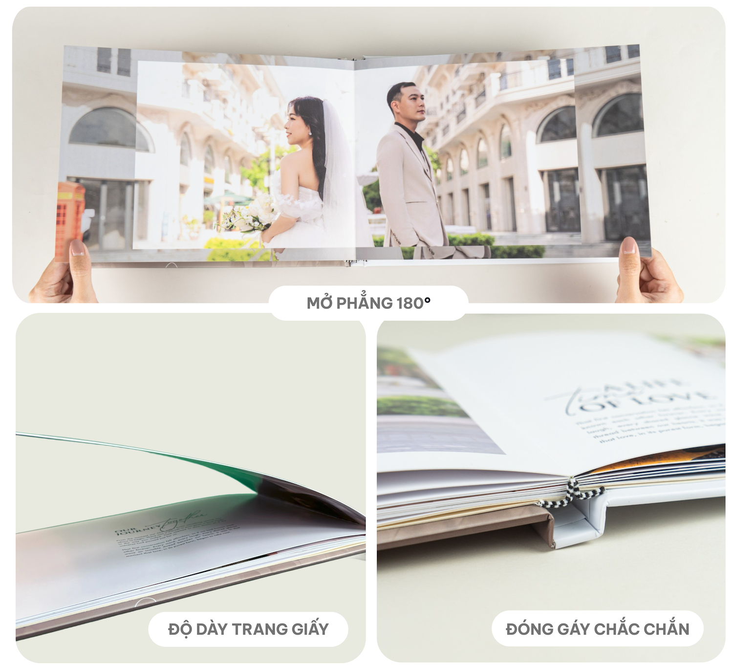 Đặc điểm Photobook mở phẳng liền trang với độ mở 180 độ mà không bị gãy trang, không có đường cắt ở giữa, không mất nội dung ở phần gáy. Với hình ảnh rộng được in trực tiếp và in tràn 2 trang trên giấy lụa chất lượng cao sẽ giúp hình ảnh của bạn trở nên sống động hơn.