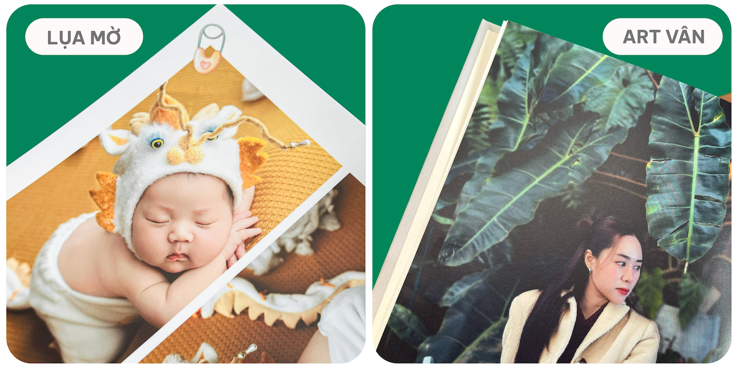 Bìa Photobook in trên giấy lụa có khả năng chống nước và chống bám bẩn cao nhờ lớp màng phủ laminate bên ngoài bề mặt giấy. Giấy lụa có bề mặt nhẵn mịn, láng, có độ bám mực tốt, mang lại độ tương phản màu sắc phong phú.