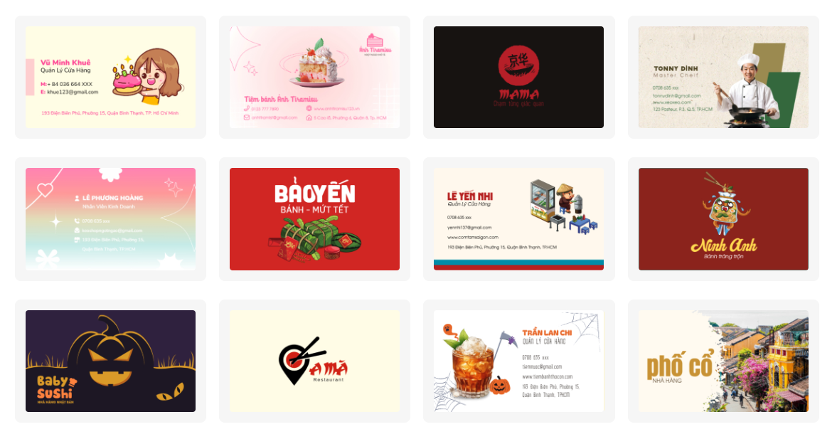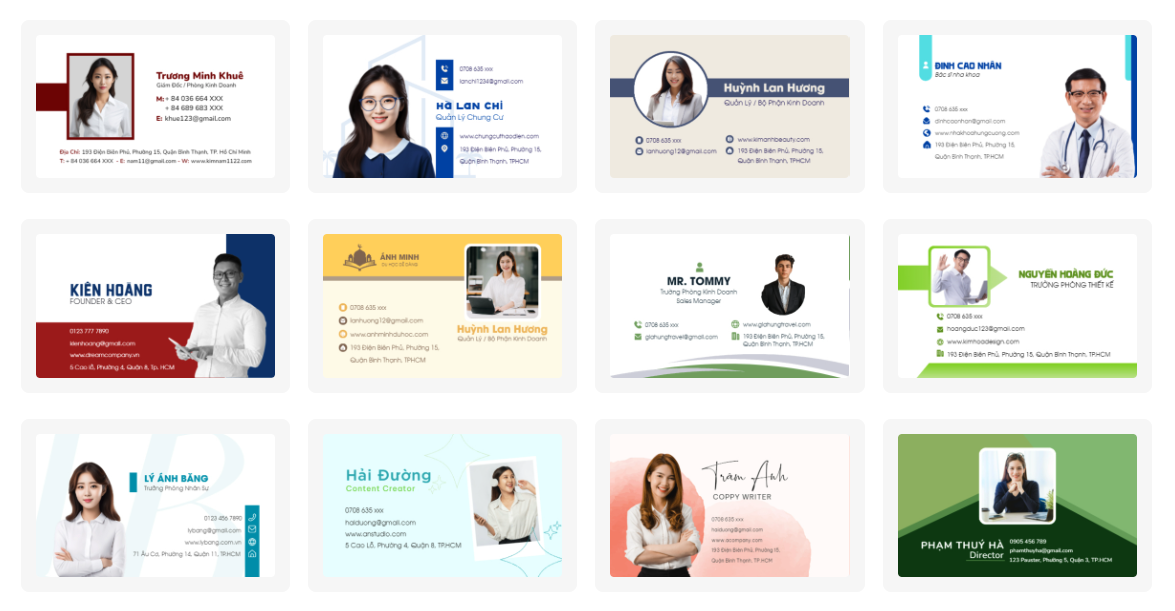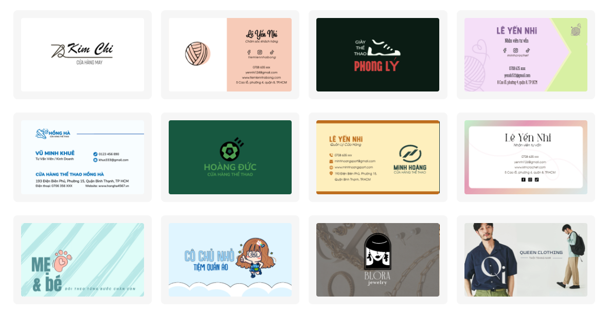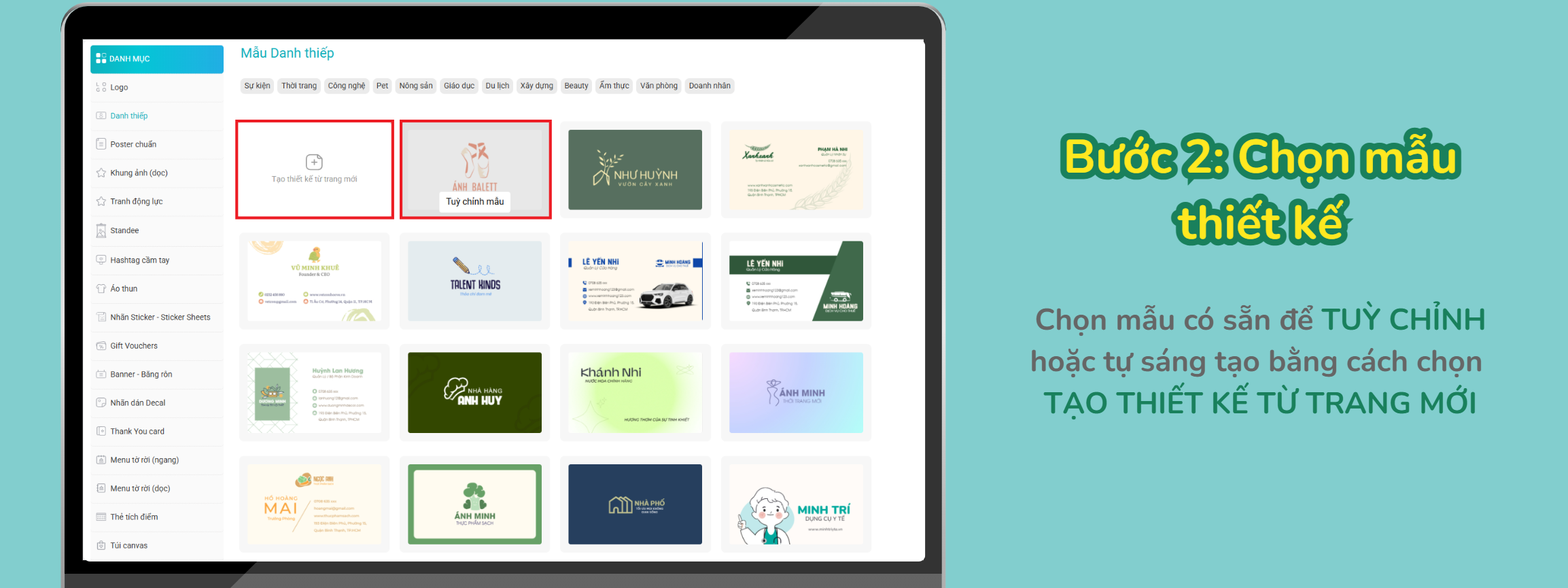 Sẽ có rất nhiều mẫu danh thiếp thiết kế có sẵn được phân ra thành nhiều chủ đề khác nhau như du lịch, thời trang, bất động sản, văn phòng,... khi bạn chọn “Danh Thiếp” ở phần danh mục.