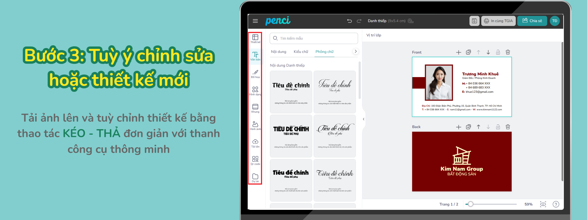 Bằng các công cụ thông minh của Penci, bạn có thể thoải mái sáng tạo Danh thiếp theo cách riêng của mình với đa dạng chủ đề, ý tưởng phong phú. Chỉ bằng thao tác kéo - thả đơn giản trong vài phút thôi, bạn sẽ có ngay một ấn phẩm ưng ý.