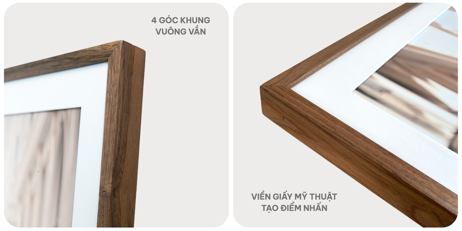 Khung gỗ walnut bo tròn không chỉ giúp bảo vệ hình ảnh mà còn là điểm nhấn sang trọng cho không gian. Với điểm nhấn là viền trắng giấy mỹ thuật giúp bức ảnh có chiều sâu hơn. Kết hợp công nghệ in ấn 4K sắc nét, mang lại độ sâu và hiệu ứng phản chiếu ánh sáng, làm hình ảnh thêm phần nổi bật.