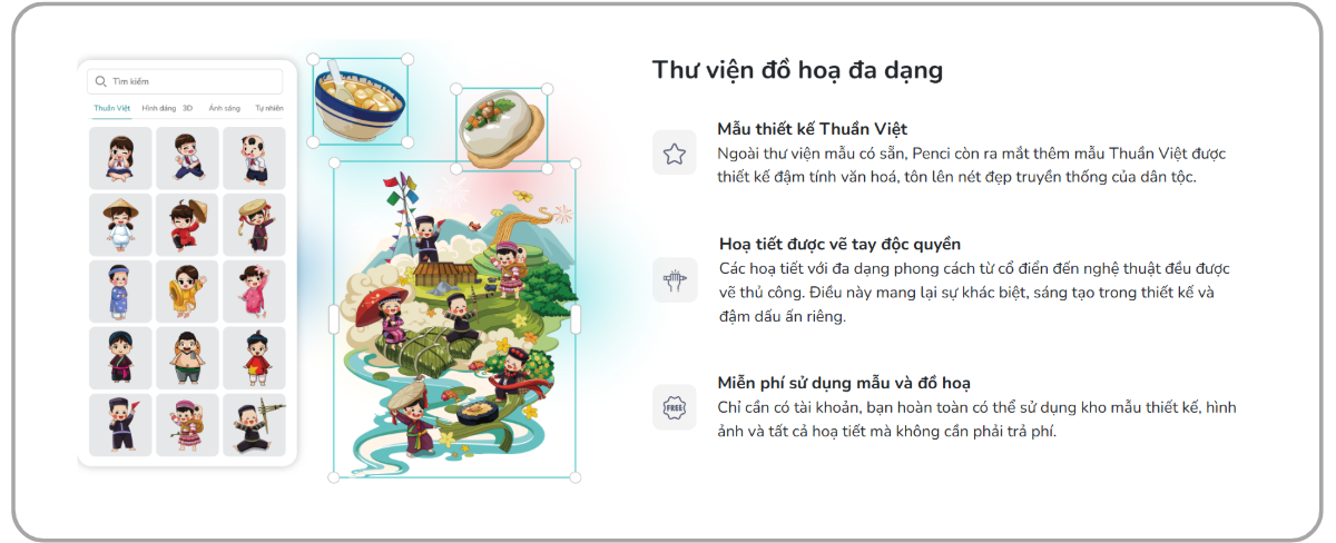 Không giống những công cụ thiết kế khác, Penci tự hào sở hữu một kho thư viện mẫu thuần Việt, được sáng tạo và vẽ tay từ chính đội ngũ designer trẻ. Những nét vẽ tay mộc mạc, gần gũi nhưng vẫn đảm bảo tính thẩm mỹ và hiện đại, giúp sinh viên dễ dàng tìm được thiết kế phù hợp với bối cảnh kinh doanh Việt Nam: từ quán cà phê nhỏ, những góc phố đặc trưng, đến các màu sắc văn hóa địa phương. Điều này giúp thiết kế của các sinh viên trở nên ấn tượng hơn trong mắt giảng viên và bạn bè.