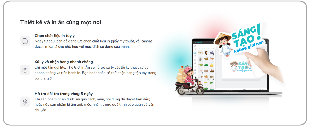 Penci là “đứa con tinh thần” của Thế Giới In Ấn. Nhờ đó, sinh viên có thể đặt in ngay sau khi hoàn thiện thiết kế, nhận sản phẩm trong ngày với mức chi phí hợp lý.
