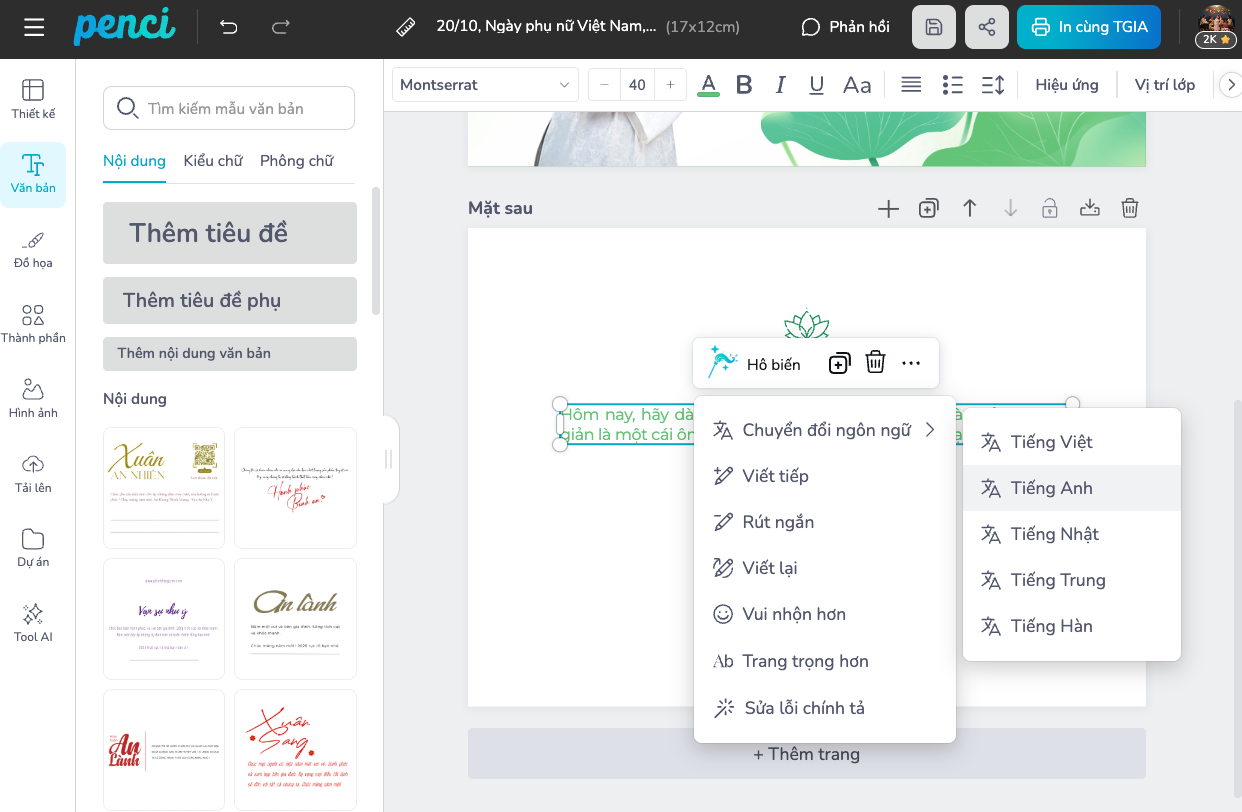 Gợi ý lời chúc 20/10 cho khách hàng, nhân viên ý nghĩa và cách tạo thiệp in hình cá nhân bằng công cụ Penci