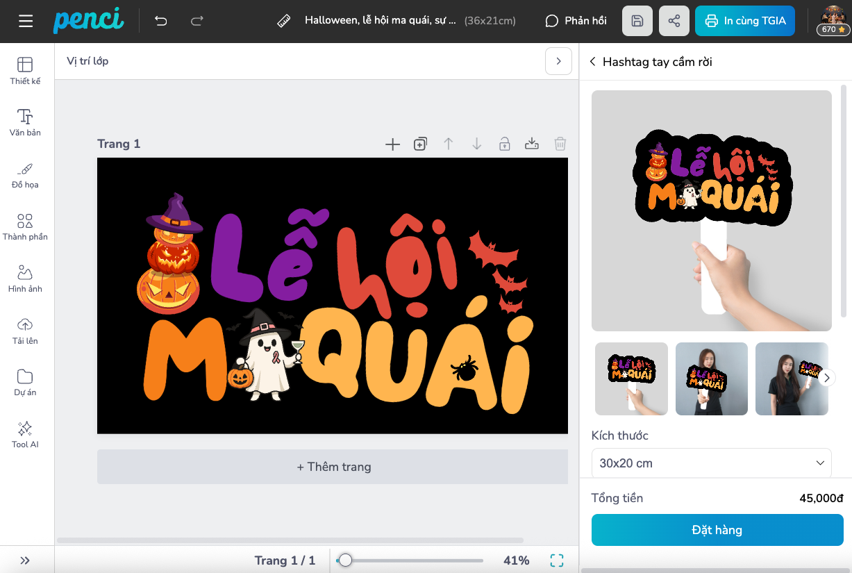 Sau khi hoàn tất, bấm “In cùng TGIA” ở góc phải màn hình. Bạn sẽ xem được mock up demo của mẫu Hashtag, sau đó tiến hành chọn các thông số cần in (kích thước, số lượng...) và chờ Thế Giới In Ấn giao những cây Hashtag đến bạn nhé.