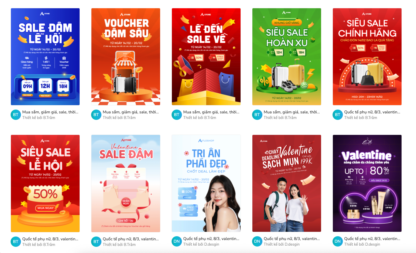(Giao diện thư viện mẫu poster với đa dạng chủ đề (khuyến mãi, khai trương, workshop, sự kiện,...)
