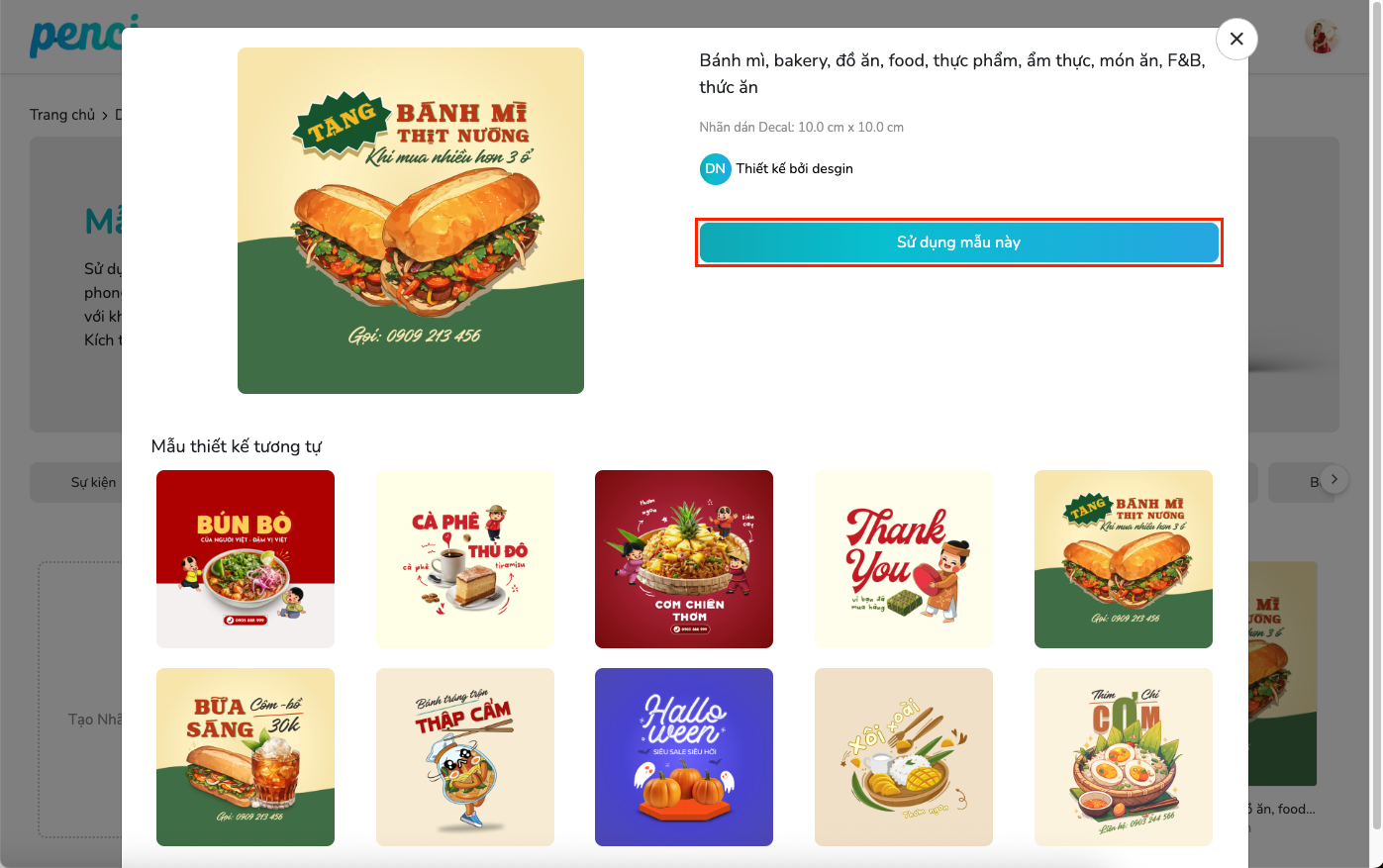 - Nếu bạn muốn thiết kế nhanh hãy chọn mẫu có sẵn từ thư viện Nhãn dán Decal Penci, nhấn “Sử dụng mẫu này”