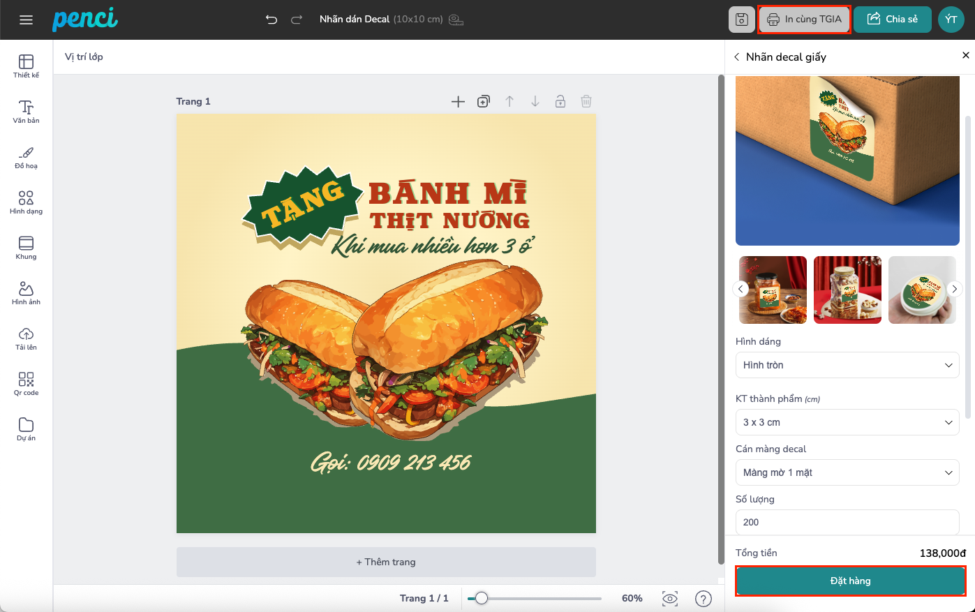 Sau khi hoàn tất thiết kế, bạn chọn “In cùng TGIA” để đặt in và nhận decal chất lượng trong ngày.