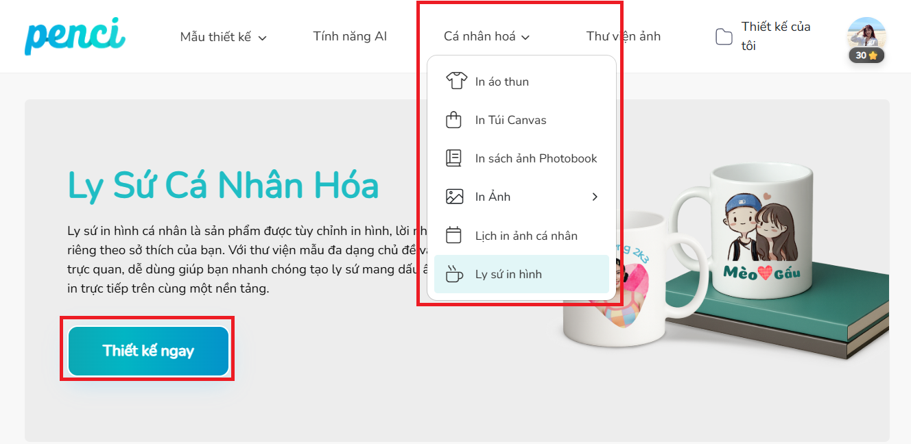 Truy cập penci.vn tại mục Cá nhân hóa → Ly in hình hoặc truy cập Penci – In hình ly sứ theo yêu cầu chọn “Thiết kế ngay” để bắt đầu tự thiết kế và in ly sứ online chất lượng chỉ trong vài phút.