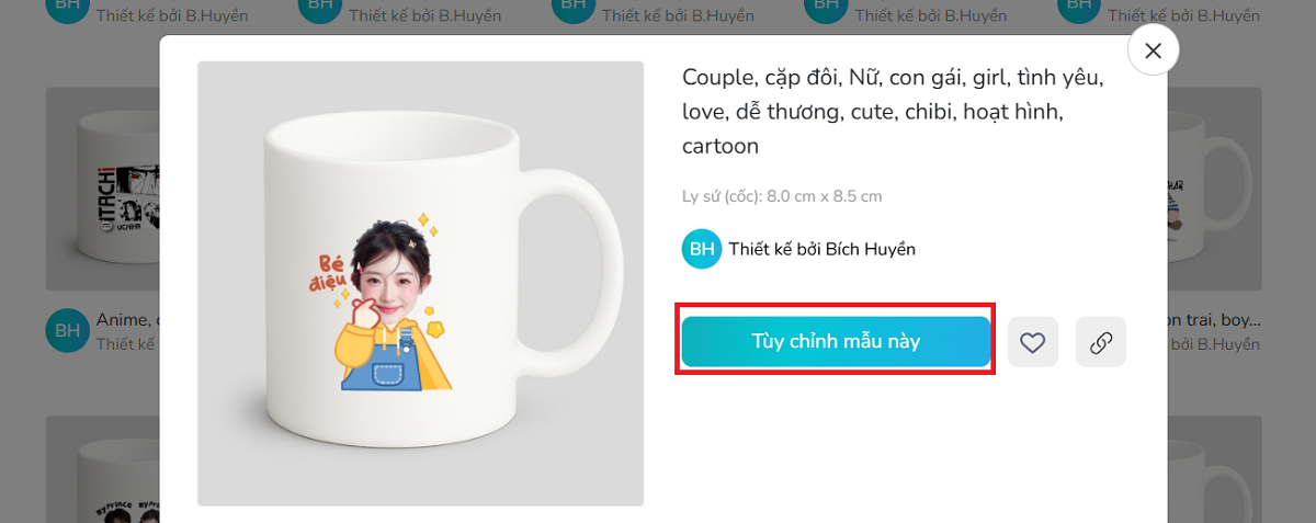 (Chọn mẫu ly sứ in hình yêu thích và chọn “Tùy chỉnh mẫu” để bắt đầu tự thiết kế )