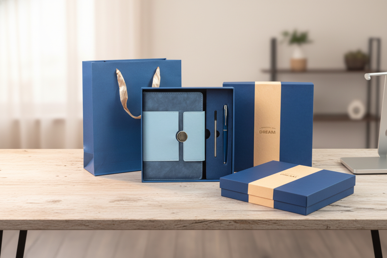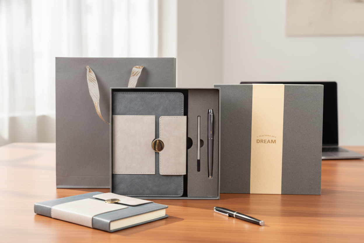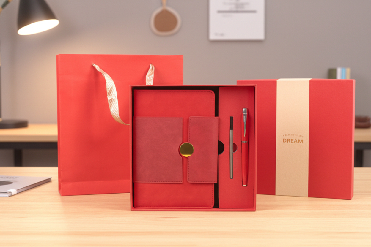 Toàn bộ được đặt trong hộp quà tặng sang trọng, kết hợp cùng túi giấy đồng bộ để tăng tính thẩm mỹ khi trao tặng. Từ khoảnh khắc người nhận cầm trên tay chiếc túi quà, mở nắp hộp và chạm vào cuốn sổ, tất cả đều tạo nên một trải nghiệm trang trọng, chỉn chu và đầy tôn trọng.