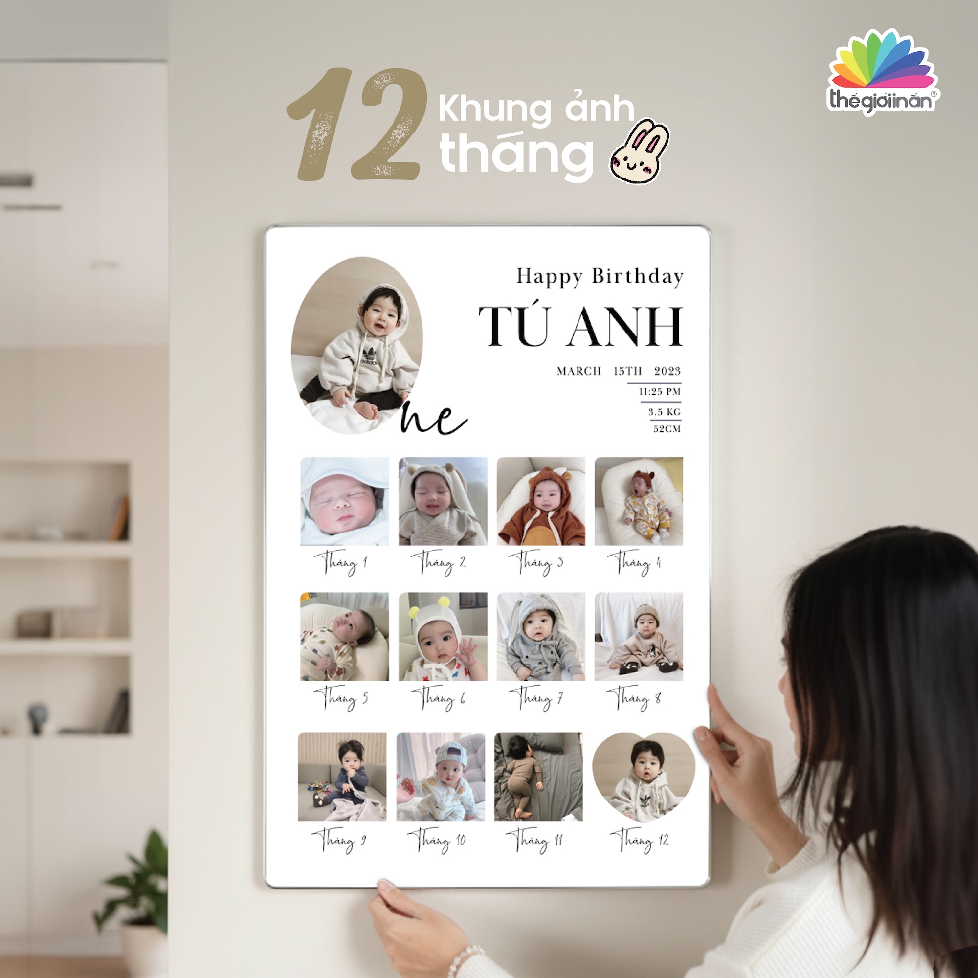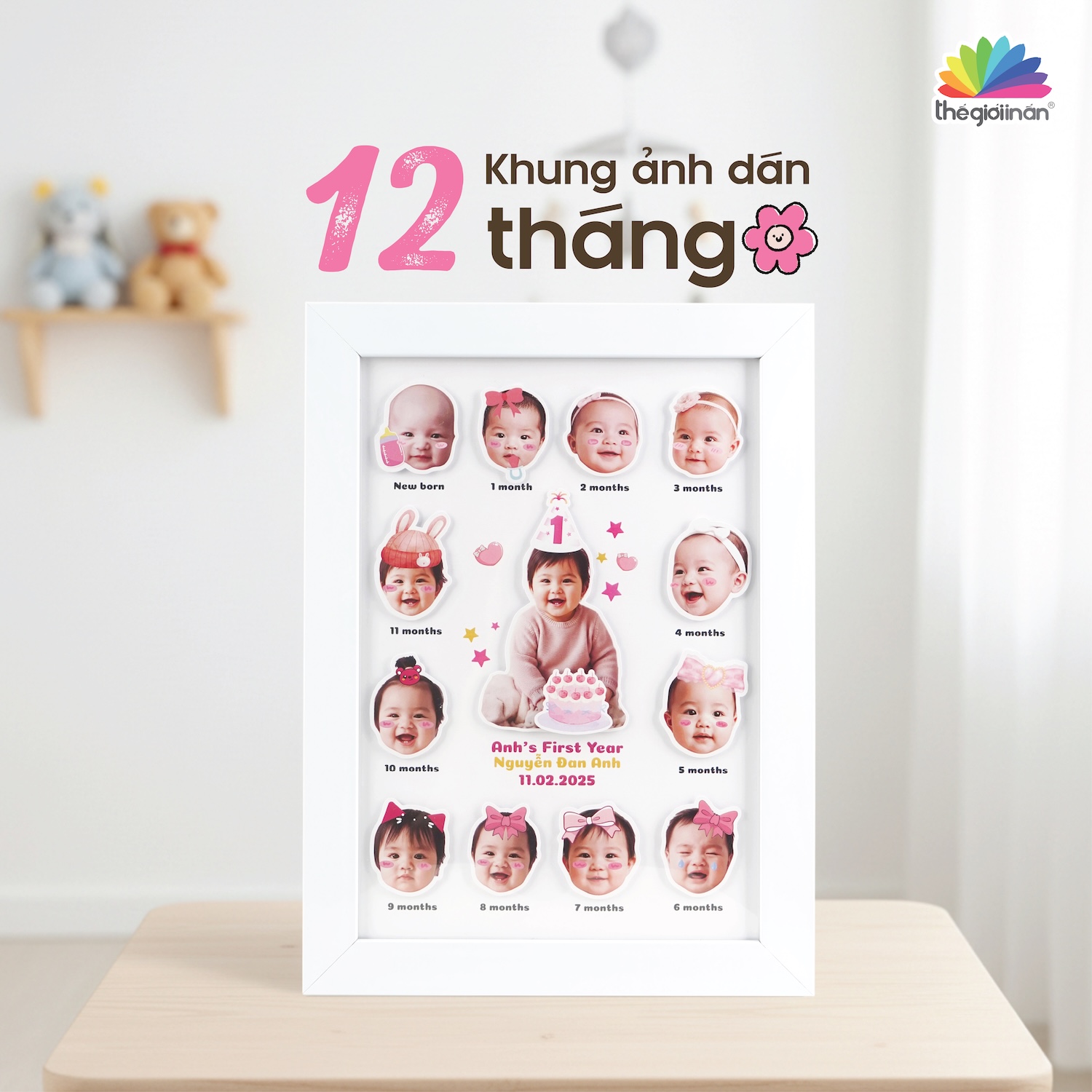 Ứng dụng: Khung có thể treo tường hoặc để bàn, trang trí phòng ngủ bé, phòng khách hoặc làm quà tặng ông bà rất ý nghĩa. Chỉ cần mỗi tháng chọn một tấm ảnh “xinh xắn” nhất, bố mẹ đã có ngay khung ảnh 12 tháng vừa đẹp vừa giàu cảm xúc.