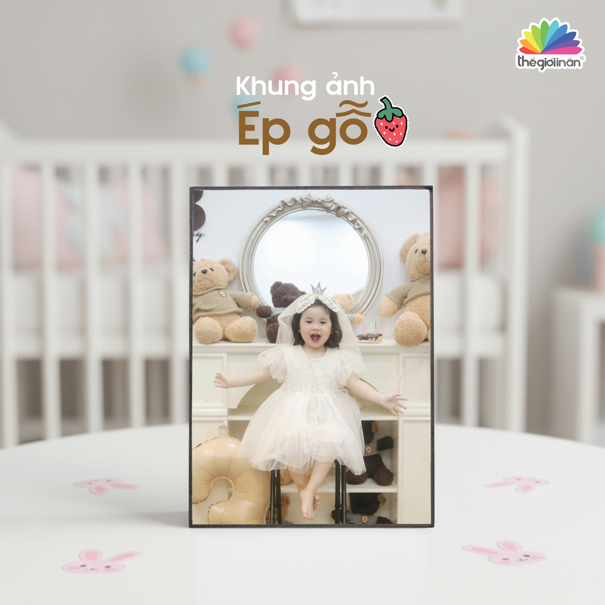 - Ảnh phóng ép gỗ: Ảnh phóng in sắc nét, ép lên tấm gỗ MDF dày dặn, bề mặt phẳng, chắc chắn, dễ treo tường hoặc dựng trên kệ.