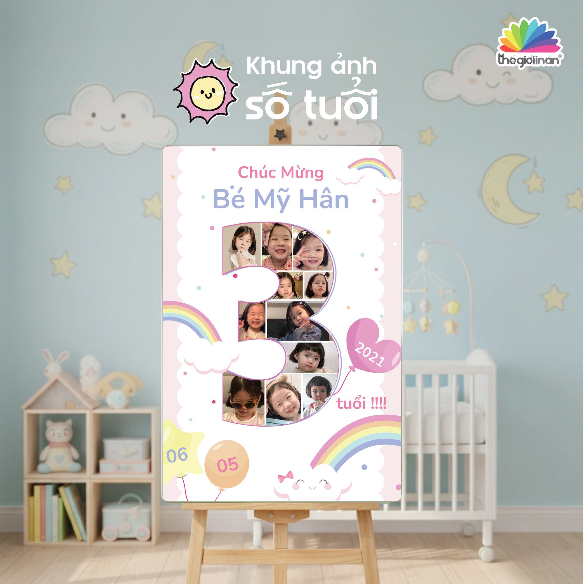 Làm nổi bật con số tuổi (1, 2, 3, 4…) cùng ảnh bé trong năm đó. Phù hợp cho ảnh sinh nhật, mỗi năm một khung, tạo thành bộ sưu tập tuổi thơ dọc bức tường.