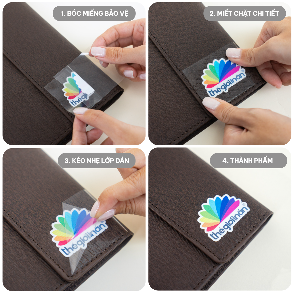 Hiểu đơn giản: thay vì phải in thẳng logo, thông tin lên túi/hộp/ly, bạn in logo lên nhãn UV-DTF, sau đó dùng nhãn này dán lên bề mặt sản phẩm mà bạn muốn hiển thị logo, thông tin thương hiệu.