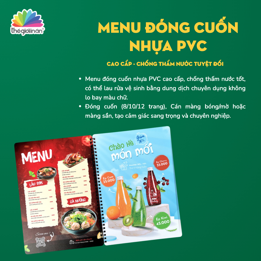Tại Thế Giới In Ấn có 2 kiểu Menu đóng cuốn: Menu đóng cuốn (giấy Couche), Menu đóng cuốn (nhựa PVC)