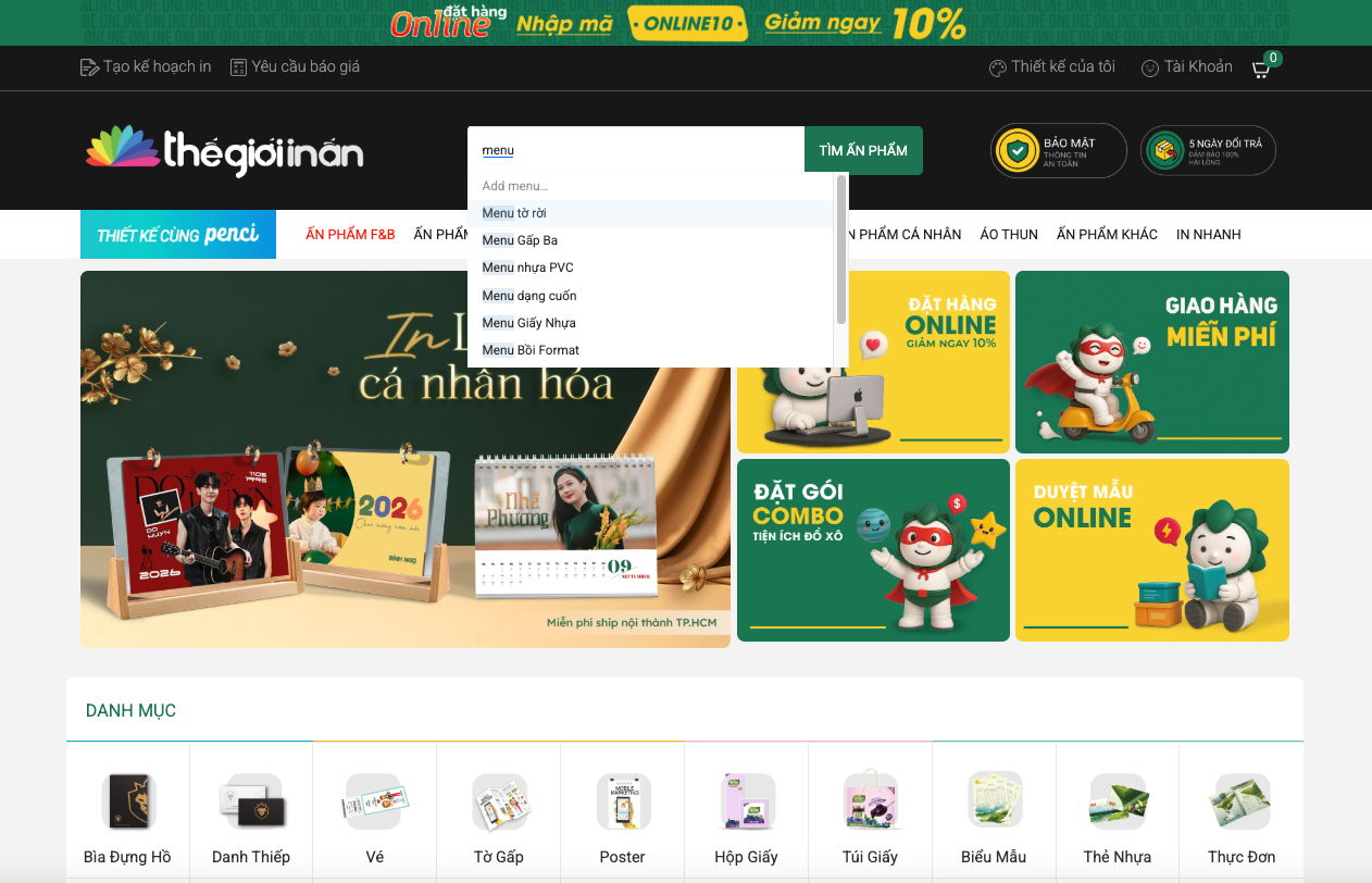 Truy cập website: thegioiinan.com --> Chọn danh mục: Menu --> Chọn loại menu phù hợp (menu rời hoặc menu cuốn)
