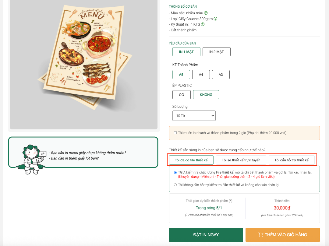 Chất liệu, kích thước, số trang (đối với menu cuốn). Website sẽ hiển thị giá cụ thể ngay, giúp bạn dễ dàng so sánh và lựa chọn mà không cần tư vấn báo giá phức tạp.