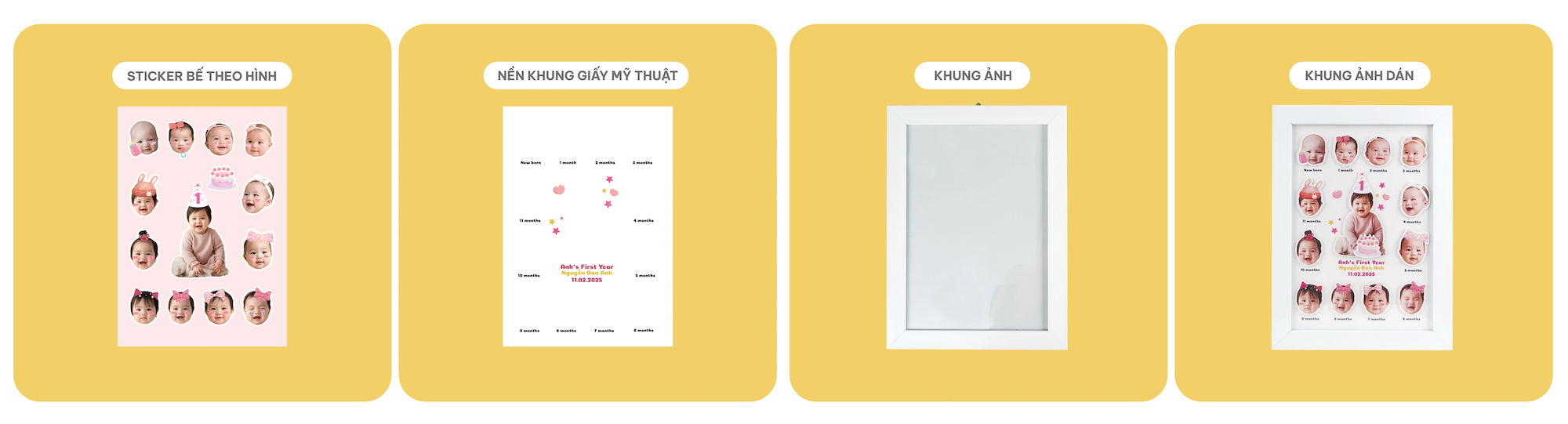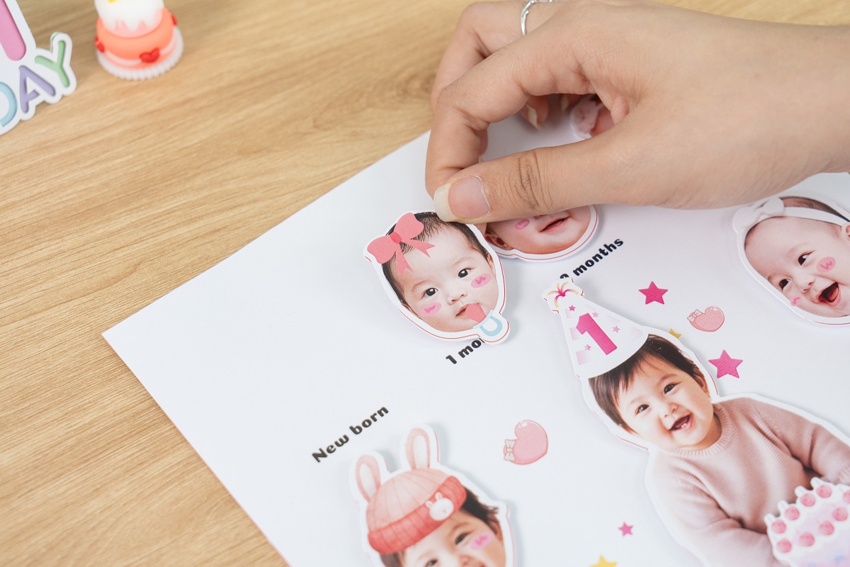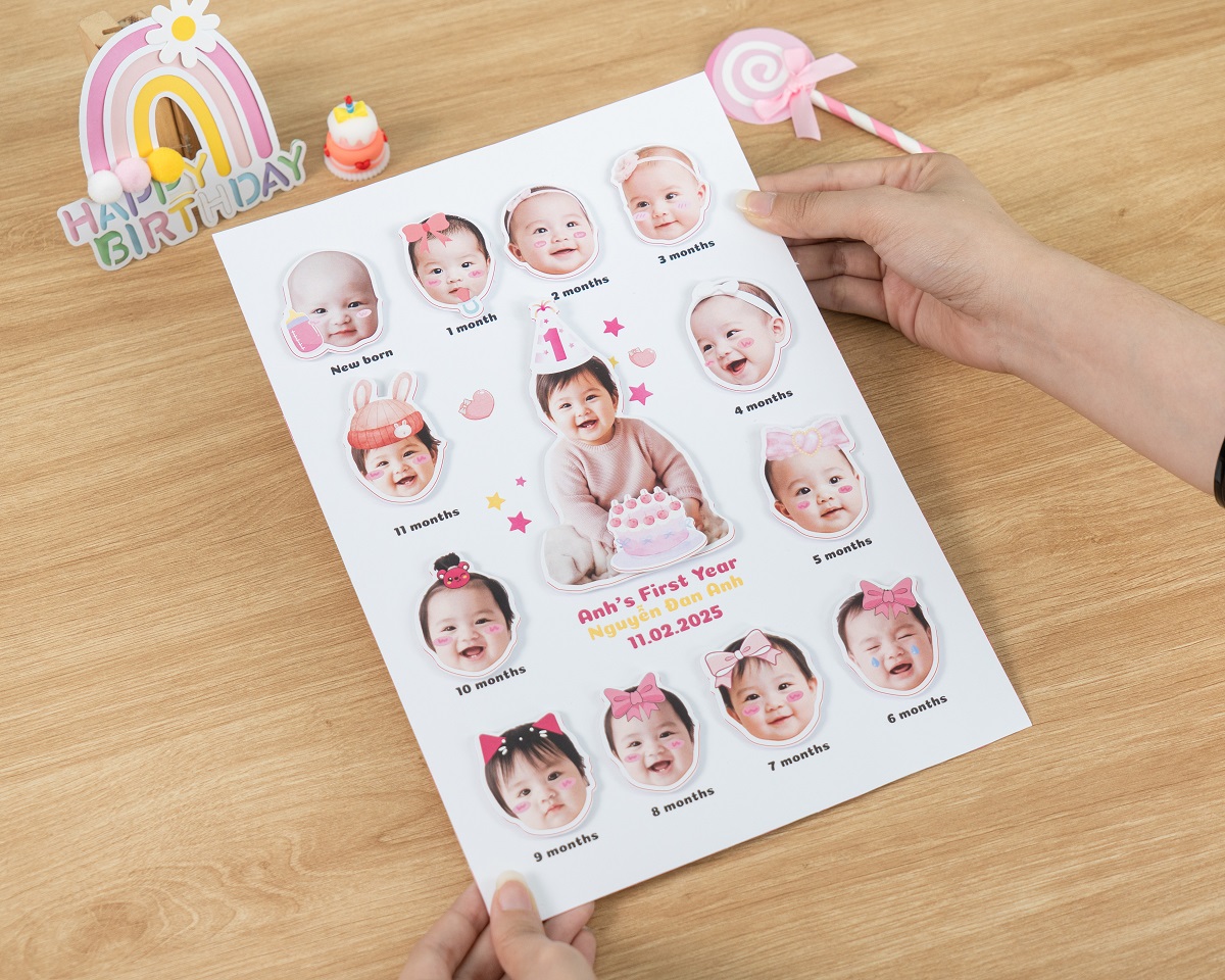 - Ảnh và sticker: Gồm 13 ảnh bé theo tháng (12 tấm ảnh nhỏ và 1 ảnh chính). Hình in được cắt bế sẵn theo viền hình bằng công nghệ hiện đại, gọn gàng, ba mẹ không cần phải tự cắt tay.