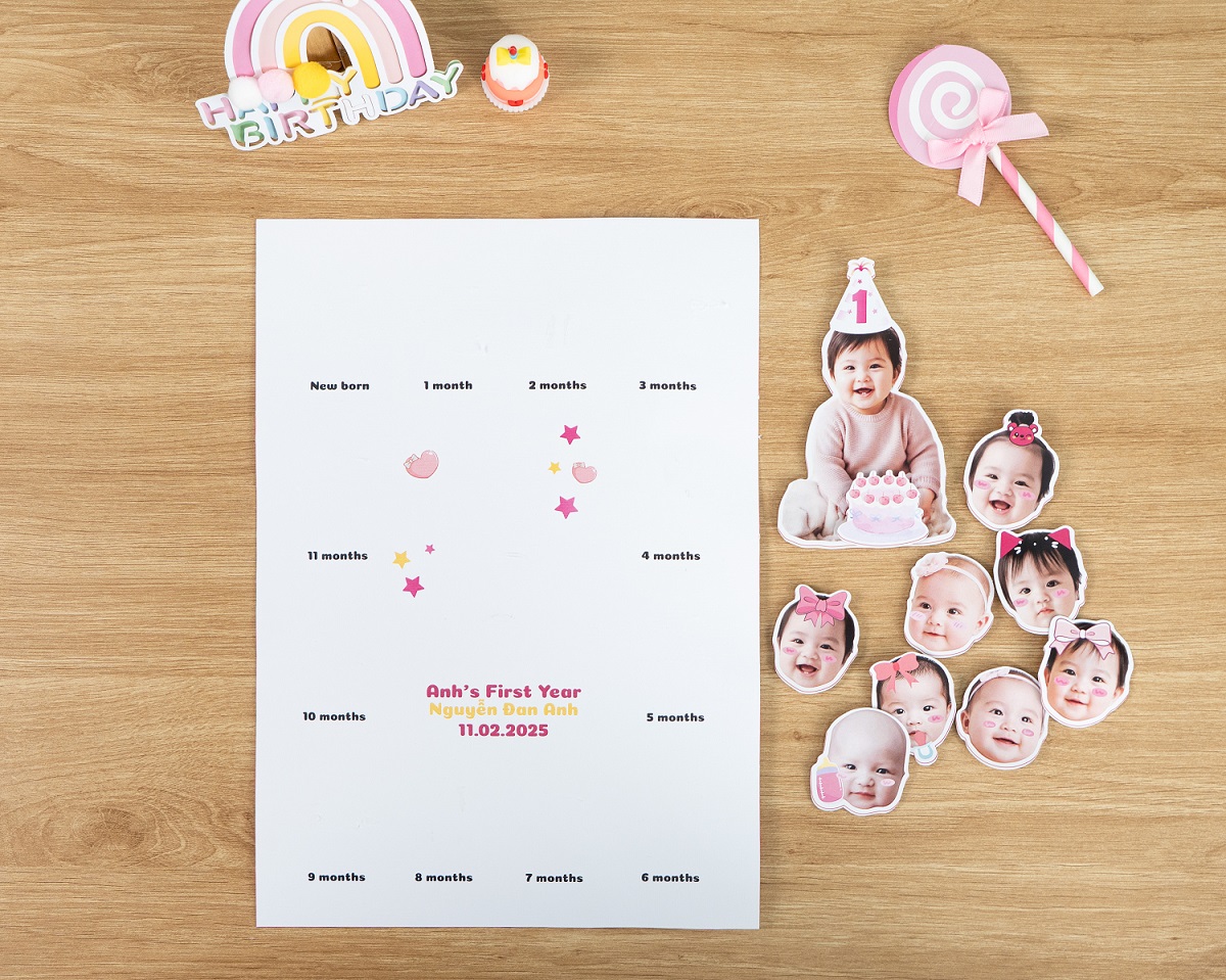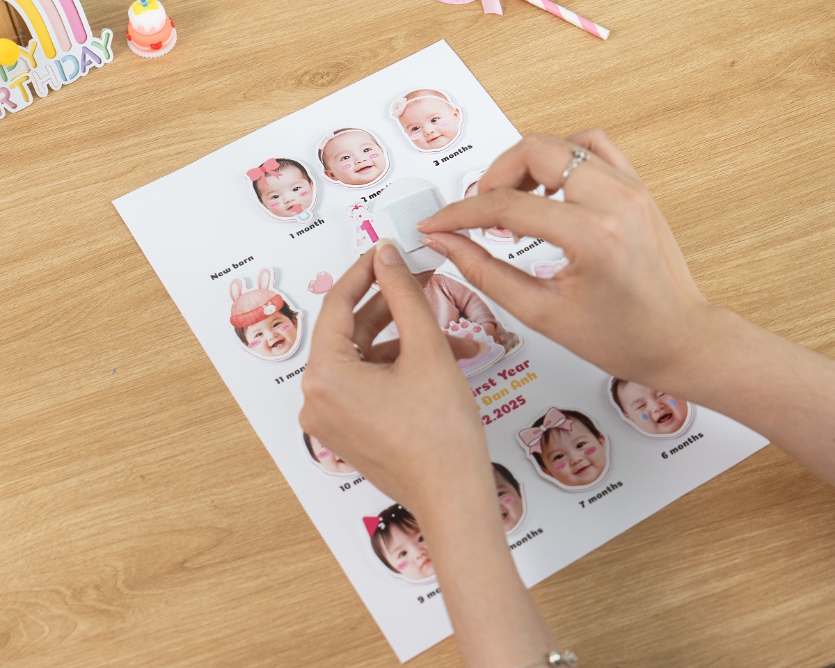 Dựa trên bố cục 12 ô ảnh đã được in sẵn trên nền giấy mỹ thuật, bạn lần lượt đặt ảnh kỷ niệm 12 tháng đầu đời của con vào đúng vị trí. Bạn có thể tùy biến thêm các sticker trang trí khung ảnh để tạo nên khung ảnh 12 tháng phong cách dễ thương theo ý thích cá nhân.