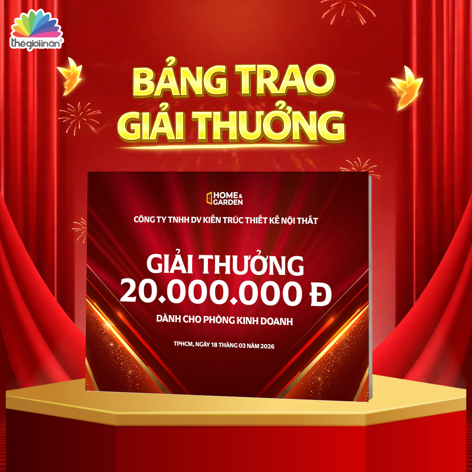 Bảng vinh danh và bảng trao thưởng tại TGIA được làm từ chất liệu PP bồi format dày 5mm, thường in các kích thước phổ biến như 40x60cm hoặc 50x70cm. Bề mặt bảng được cán màng mờ một mặt, giúp hạn chế lóa sáng khi lên sân khấu và chụp hình. Bảng nhẹ, dễ cầm, màu in sắc nét, bố cục rõ ràng, mang lại cảm giác trang trọng và chuyên nghiệp khi trao thưởng.