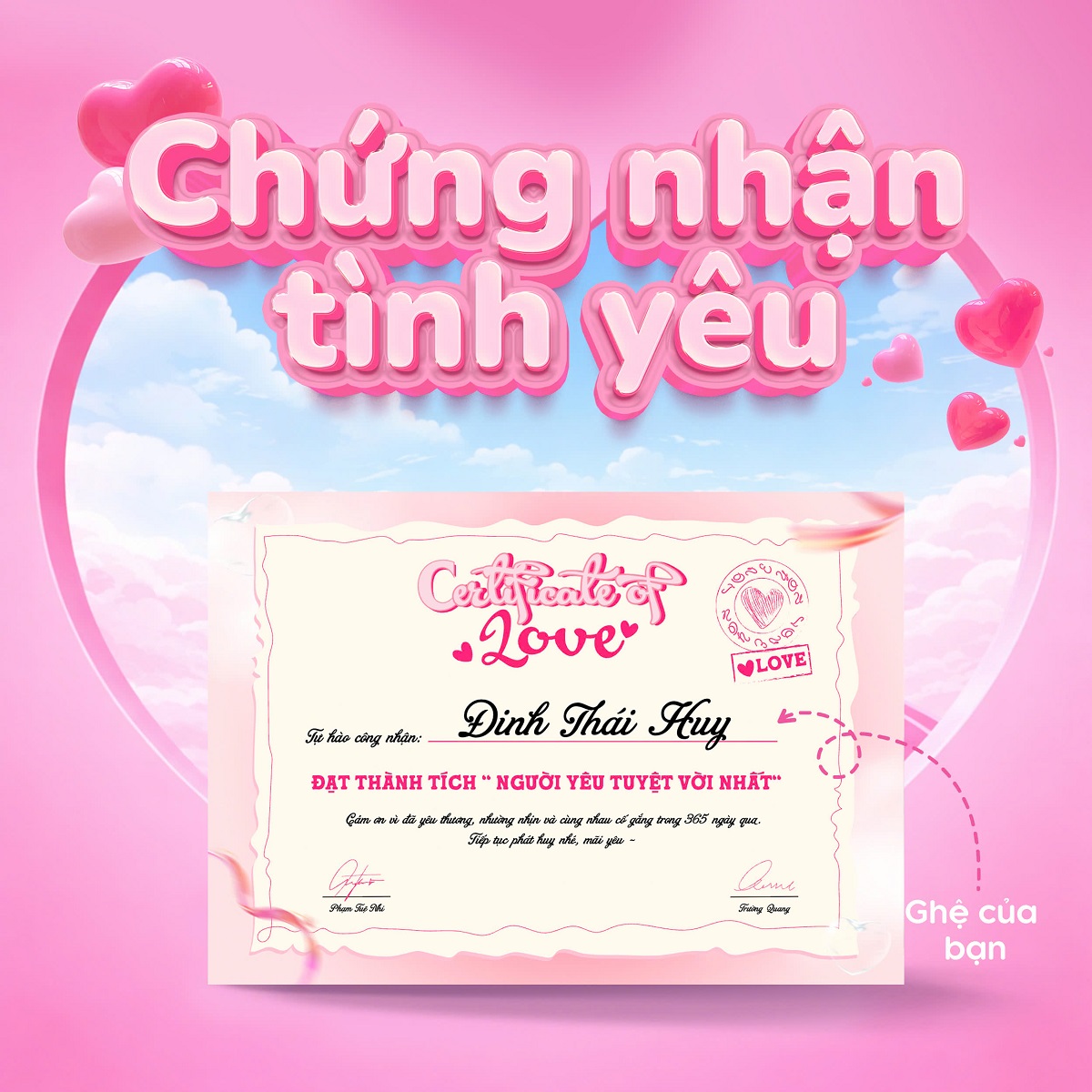Nếu bạn muốn một món quà mang tính biểu tượng và vui nhộn hơn, giấy chứng nhận tình yêu là lựa chọn thú vị. Thiết kế có thể ghi tên hai bạn, ngày kỷ niệm hoặc những “điều khoản đáng yêu”, tạo nên điểm nhấn bất ngờ và giúp Valentine trở nên đáng nhớ hơn.
