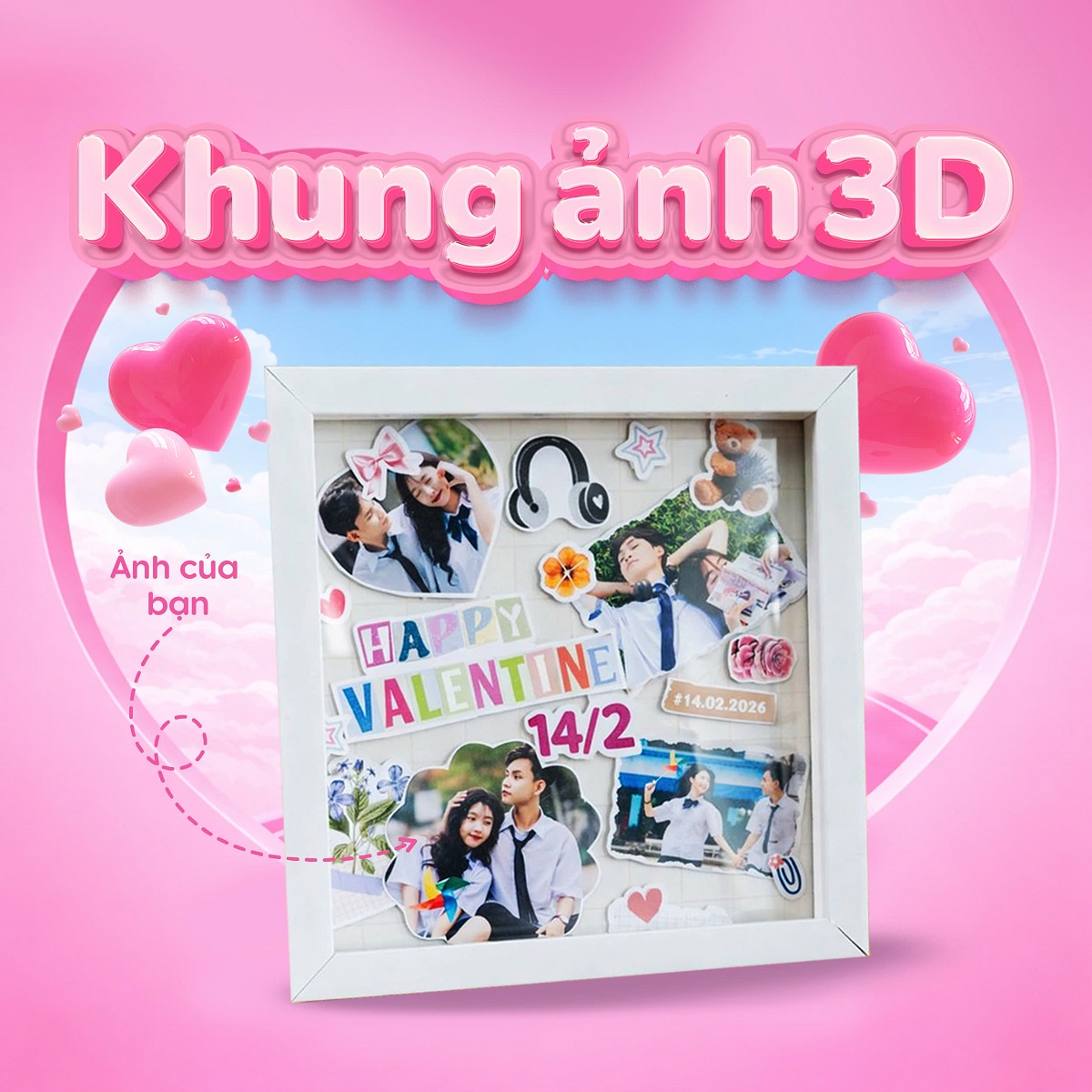Khung ảnh 3D handmade luôn nằm trong top quà Valentine được yêu thích vì khả năng lưu giữ kỷ niệm theo cách rất riêng. Thiết kế nhiều lớp tạo hiệu ứng chiều sâu giúp hình ảnh trở nên nổi bật và có giá trị trưng bày lâu dài. Bạn có thể in hình couple, ngày kỷ niệm hoặc lời nhắn ý nghĩa để biến món quà trở thành một góc ký ức nhỏ trong không gian sống.
