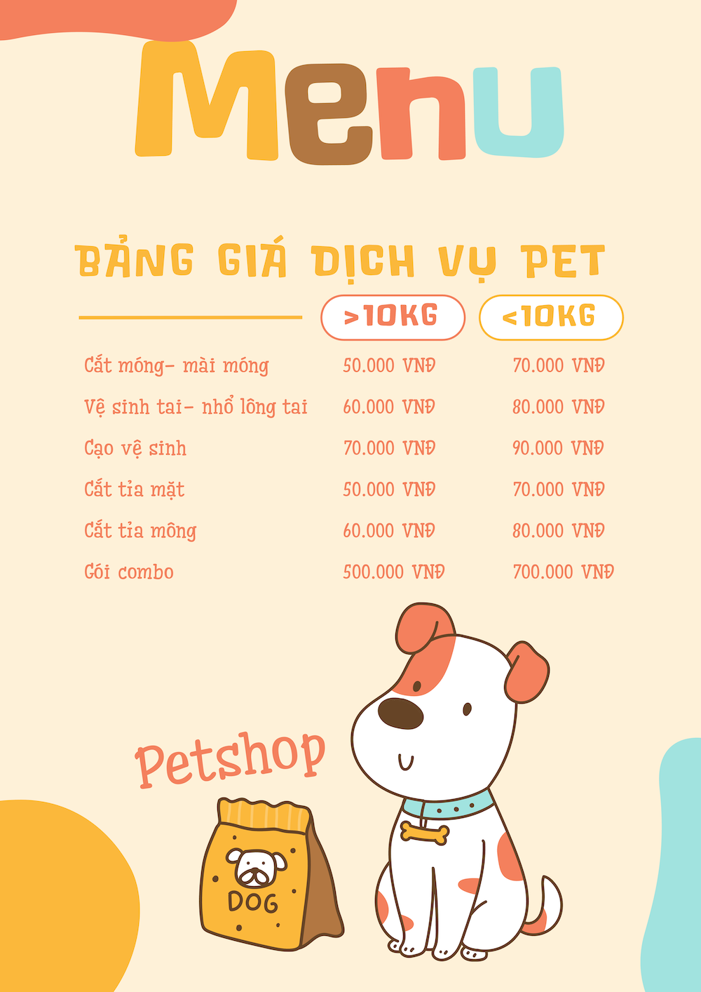 Với các shop cần phong cách dễ thương như Petshop, tiệm bán đồ chơi. Menu nên sử dụng họa tiết vui nhộn, màu sắc nhẹ nhàng và minh họa thân thiện để tạo cảm giác gần gũi ngay từ cái nhìn đầu tiên.