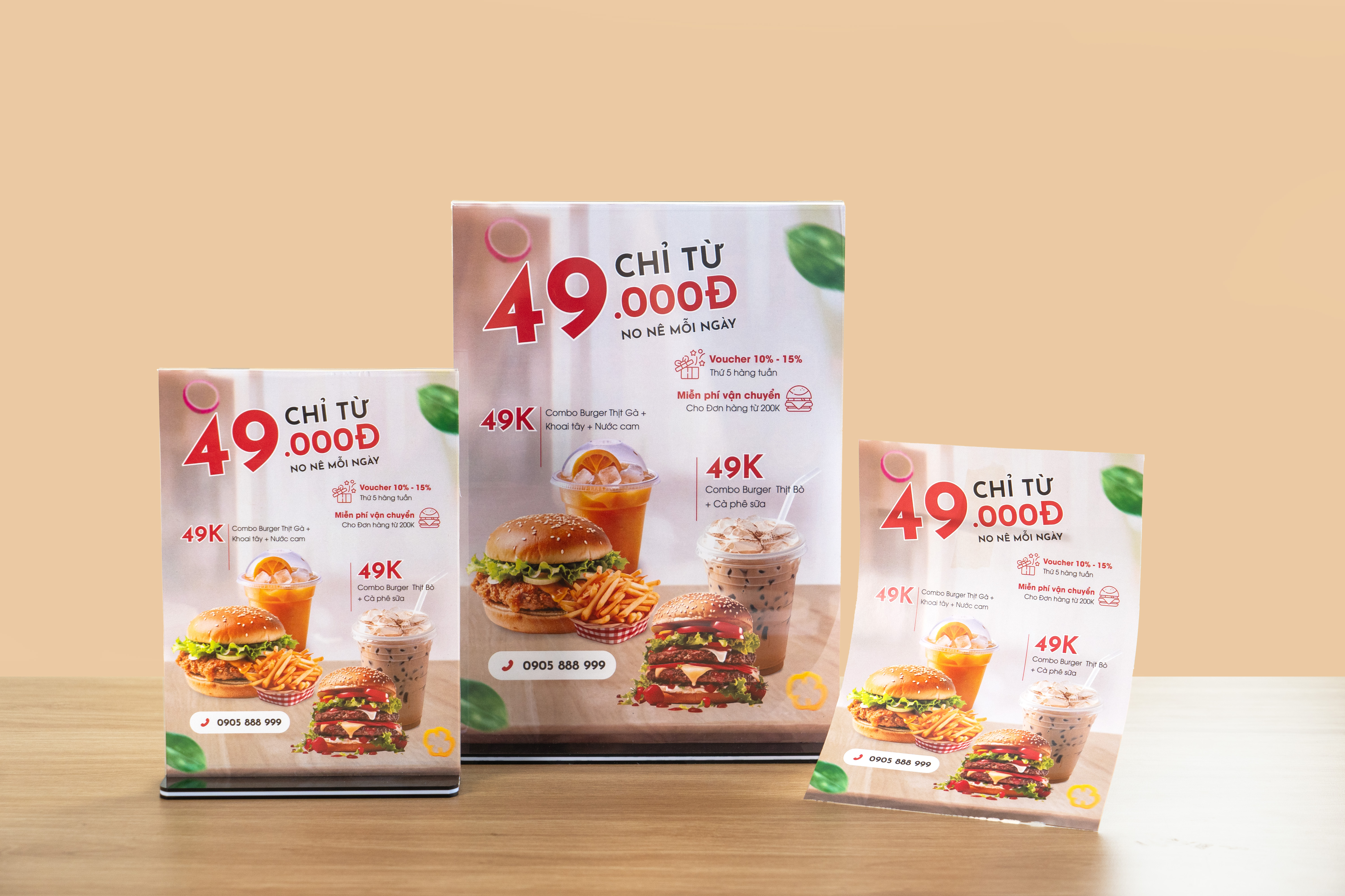Ngoài ra, bạn cũng có thể chọn lồng Menu vào đế mica trong suốt. Dạng này phù hợp với menu để bàn, bảng giá nhỏ, menu QR, thông báo món mới, chương trình khuyến mãi hoặc những nội dung ngắn cần thay đổi nhanh.