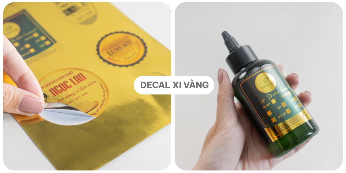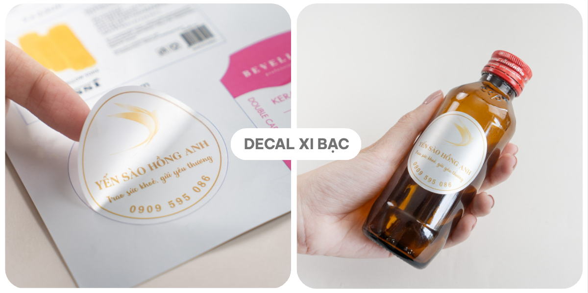 Tem nhãn decal xi vàng, bạc là hai loại tem sử dụng cho các sản phẩm cao cấp, xa xỉ. Mẫu tem này có độ bền cực cao. Chúng chịu được tác động khắc nghiệt từ môi trường, thời tiết. Đặc biệt, nước mưa và các loại nước thông thường khác sẽ không thể tác động tiêu cực tới loại tem này. Nội dung in trên tem khó bị oxi hóa hay bong tróc.