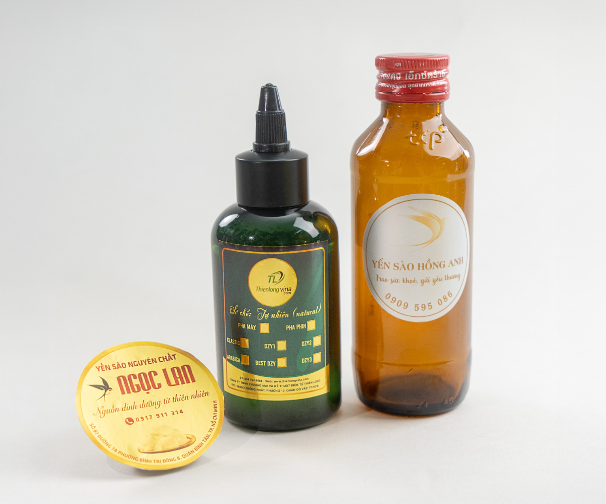 Nhãn Giấy khả năng chịu chống thấm nước kém Nhãn Nhựa có khả năng chống thấm tốt hơn Nhãn Kraft có độ sần nhẹ, màu sắc vintage, thân thiện với môi trường Nhãn xi Vàng/ Bạc bề mặt được xi bóng loáng, chống nước.